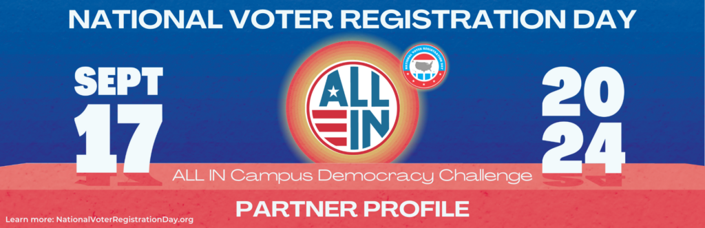 For National Voter Registration Day 2024, ALL IN is mobilizing its extensive network of campuses. Their efforts include email outreach, social media campaigns, and on-campus registration events. But their work doesn’t stop there: ALL IN is committed to “making democratic engagement programs a defining feature of campus life and culture—this NVRD and beyond.” By focusing on recruiting and supporting community colleges and Minority Serving Institutions, ALL IN is also working to close student voter participation gaps based on demographics such as age and race. They also recognize that it’s important to lift up our wins in this line of work, which is why they celebrate the achievements of their university and college partners during their biennial awards ceremony.